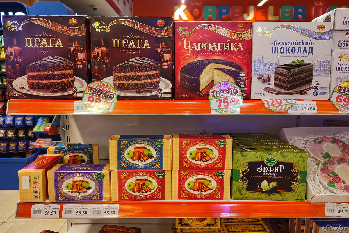 Супермаркет сети "Kamil Market" в Ашхабаде. Конкретно этот находится в ТРЦ "Беркарар", но в остальных то же самое. Торты "Прага" и "Чародейка", белевская пастила, зефир, шоколад "Аленка", вафельные тортики "Коровка" от "Рот-Фронта", Бабаевская "Белочка" и даже тульские пряники. Но есть и сугубо местные товары. Первым я заметила Покровский пряник в белом шоколаде. В прошлом году я на них подсела, впервые увидела в национальном центре "Россия", потом нашла на Озоне. Никак не ожидала увидеть эти пряники в туркменском супермаркете. Тушенка из говядины, из баранины и мясо птицы. Свинины разумеется нет. Заводы представлены самые разные, ОМКК - один из лучших магазинных вариантов. Обратите внимание, тушенка Смоленская с говядиной. Не "из говядины", а "с говядиной" :) Опаньки... Оливье! Цена - 6 манат за 100 грамм. Чтобы получить цену в рублях, надо умножить на 5. Айран льется из крана. Подобное я уже видела в Курдистане. Айран циркулирует для создания пенистой текстуры. Сыры: Гауда, Тильзитер