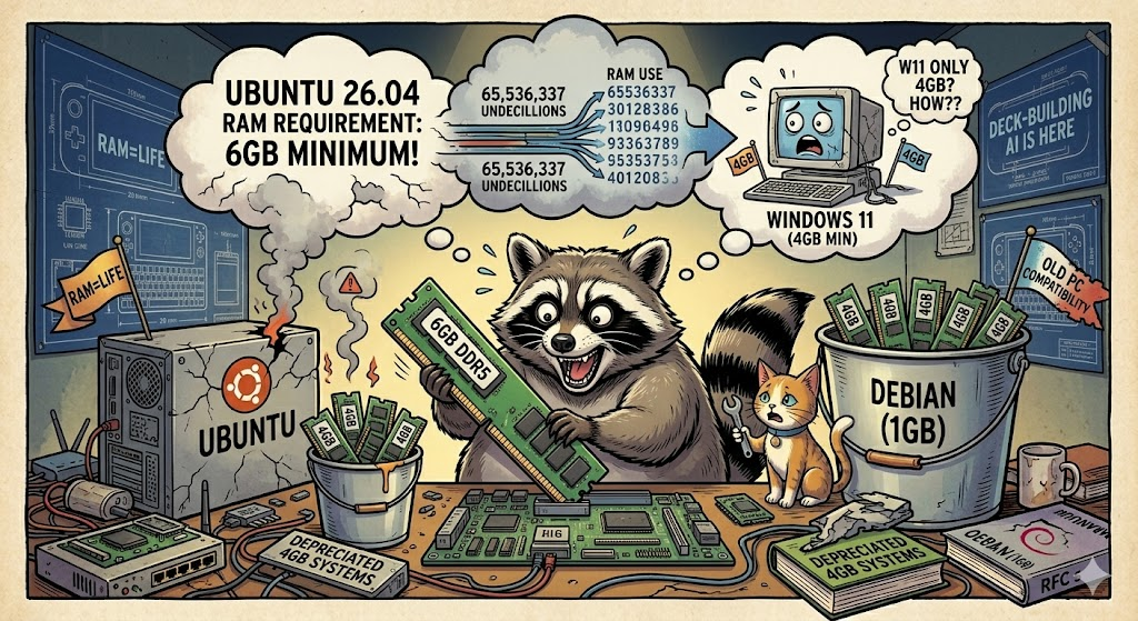 Привет! Держитесь за свои плашки памяти, мужики. Canonical решила, что 4 ГБ ОЗУ — это для слабаков и ретроградов. Пока мир стонет от дефицита полупроводников, а цены на память скачут как ненормальные из-за того, что каждый утюг теперь хочет быть нейросетью, Ubuntu 26.04 (Resolute Raccoon) тихой сапой обновила системные требования. Теперь ей подавай минимум 6 ГБ оперативы. Вы не ослышались: «народный» дистрибутив, который мы годами ставили на старые ноутбуки оживлять мертвецов, теперь официально прожорливее, чем Windows 11. У Майкрософт в минималках всё еще значатся 4 ГБ, а Марк Шаттлворт, видимо, решил, что память у пользователей растет на деревьях. Давайте вспомним, как мы докатились до жизни такой. Это же настоящий сериал про обжорство: При этом Canonical технично переводит стрелки. Мол, это не мы такие, это жизнь такая: тяжелый GNOME, прожорливые браузеры и сторонний софт. Ага, конечно. Debian, на котором Ubuntu основана, до сих пор прекрасно себя чувствует с 1 ГБ, а Linux Mint не в