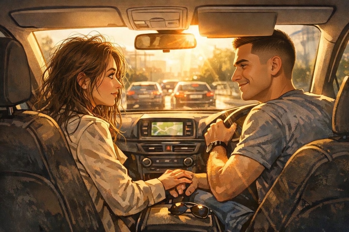 В машине играло радио — какой-то попсовый трек, который Саша переключил четыре раза, прежде чем найти старый рок. Юля задумчиво смотрела в окно. Апрель был холодным, но солнечным, и город казался почти красивым.
