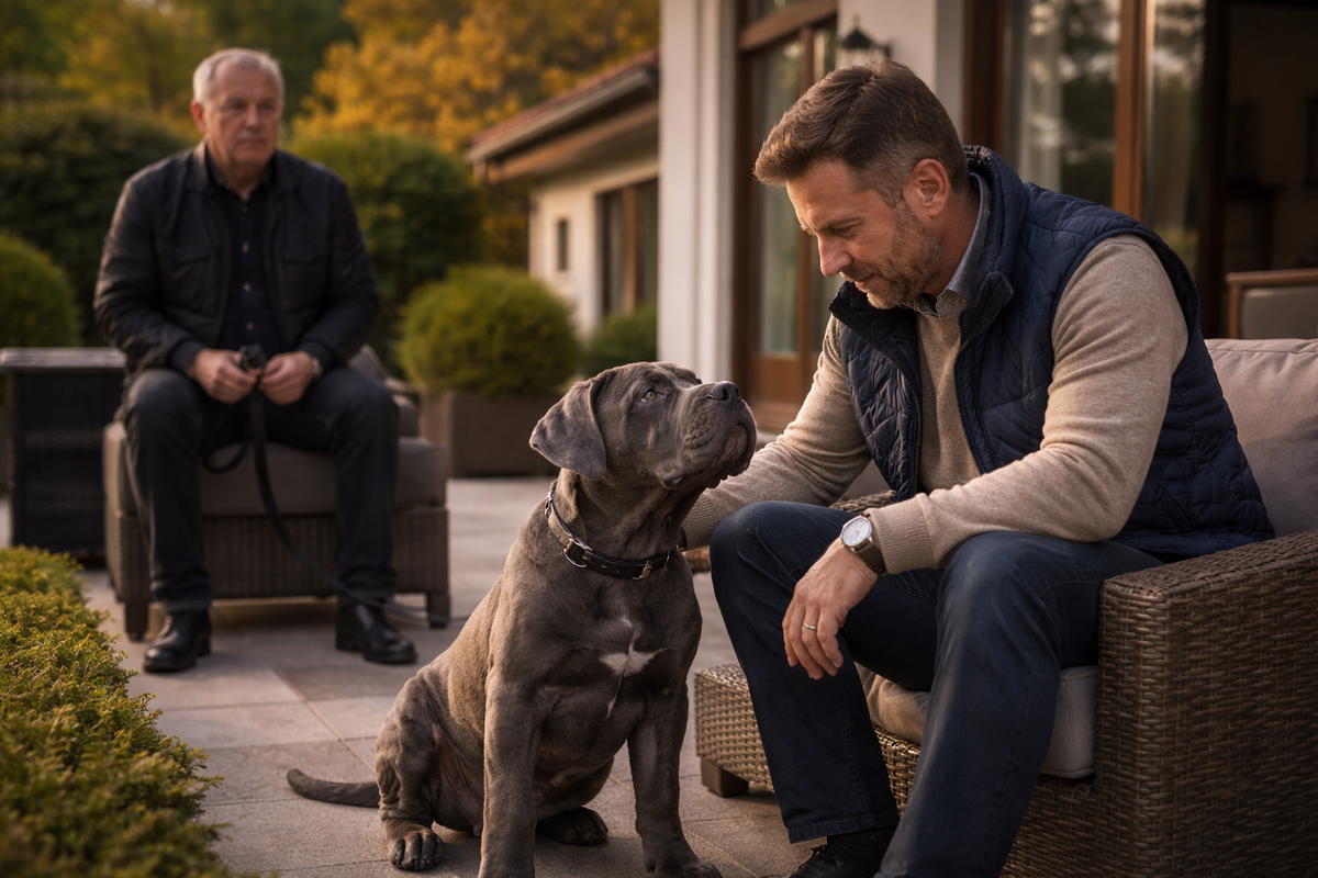 Рядом лежал щенок кане-корсо. Большой уже, месяцев шесть, серо-графитовый, с тяжёлыми лапами, умной складкой на лбу и взглядом ребёнка, которого завели для интерьера, а он взял да и оказался живым.