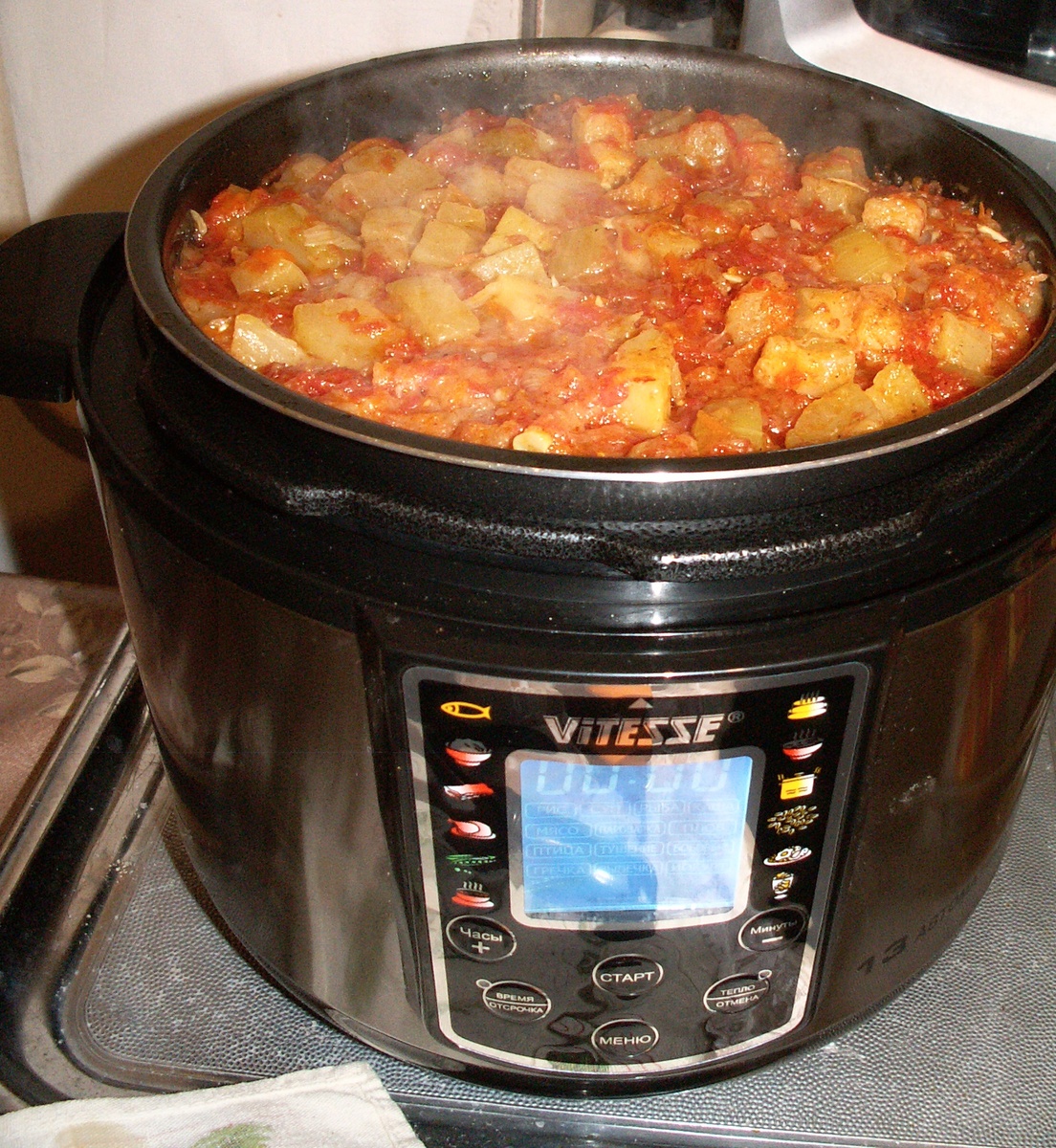 Закрываем крышку. Клапан — в положение «Закрыто». Выбираем режим «Мясо» или «Тушение» под давлением. Время — 35 минут. Для старого мяса можно 40, но 35 — золотая середина.
