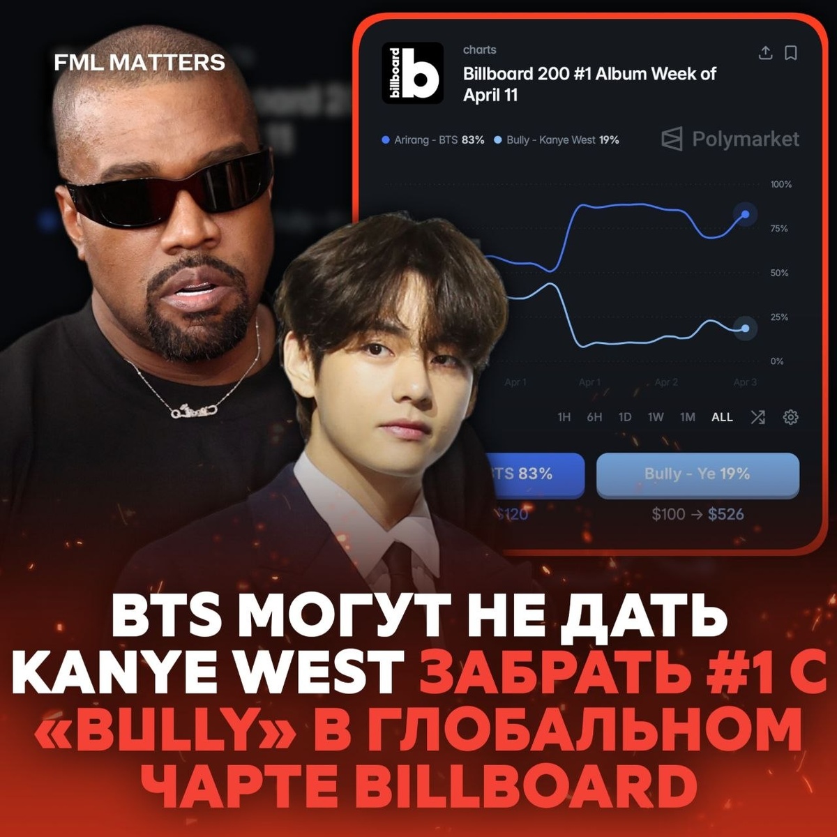 ❌ BTS МОГУТ НЕ ДАТЬ KANYE WEST ЗАБРАТЬ #1 С «BULLY»! По данным Polymarket, у BTS сейчас около 83% шансов обойти Йе и его «BULLY» в гонке за #1 альбом недели в глобальном чарте Billboard. Кто заберёт? 💀 FML MATTERS