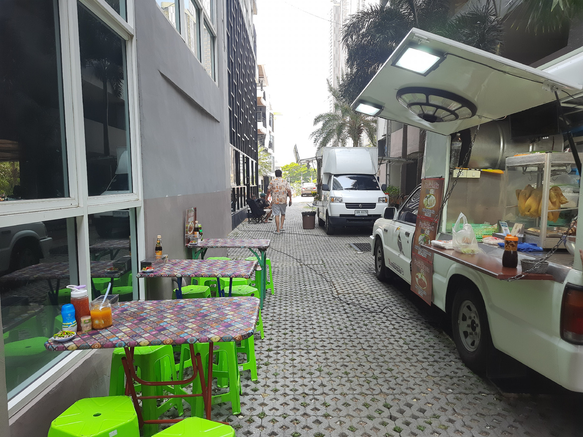 Пообедать решили в макашнице, которая каждый день приезжает прямо к нашему кондо. Вернее, это даже не макашница, а две машины-кафе. В одном продают различные тайские холодные напитки, а во втором готовят горячие блюда. Тут же выставляются столы со стульями.
