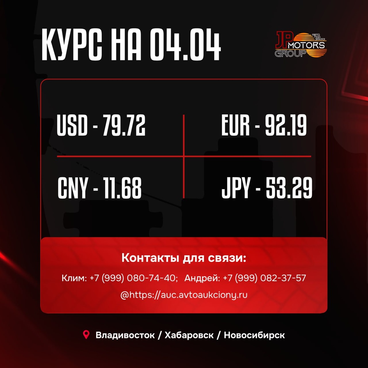 Актуальные курсы (к рублю) для переводов: • Доллар (USD) — 79.72₽ • Евро (EUR) — 92.19₽ • Китайский юань (CNY) — 11.68₽ • Японская йена (JPY) — 53.29₽ Оставьте заявку на расчёт стоимости авто — подберём лучшие варианты с учётом новых курсов. #курс