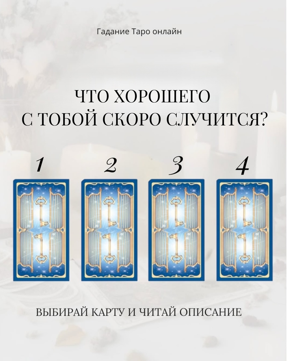 Привет мои дорогие, на связи с вами Анастасия😘 Узнай, что хорошего уже на пороге в твоей жизни. Этот расклад Таро покажет позитивные перемены, финансовые возможности, новости и события, которые приведут тебя к стабильности и гармонии. Выбери карту и прочитай свое предсказание.
