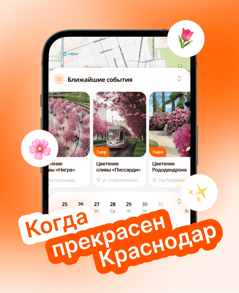 Весна в Краснодаре — это не только тепло, но и короткий период, когда город становится особенно красивым. Сакура, магнолии, тюльпаны — у каждого растения всего несколько недель, а иногда и дней. Если пропустить — придётся ждать ещё год. Собрали удобный календарь цветения, чтобы вы не упустили самые атмосферные моменты этой весны. Весна начинается с магнолий — крупных, нежных цветов, которые появляются одними из первых. Это ещё не тёплые прогулки в футболке, но уже повод выйти в город и почувствовать смену сезона. 📍 Где искать: Самое ожидаемое цветение. Сакура цветёт очень недолго — обычно около недели, поэтому важно попасть в нужный момент. Атмосфера в это время особенная: прогулки, фотосессии и ощущение, что город на пару дней становится другим. Один из самых ярких периодов — клумбы с тюльпанами по всему городу. Цвета, геометрия, аккуратные композиции — идеальный фон для прогулки или фото. 📍 Где смотреть: После сакуры город не «заканчивается» — продолжают цвести другие деревья и