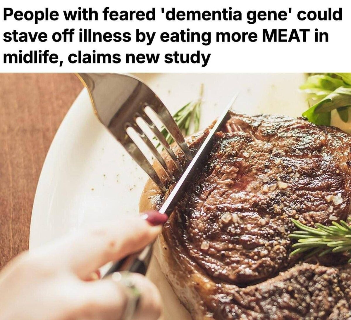 15 лет ученые наблюдали за людьми старше 60 лет и выяснили: у носителей гена Альцгеймера, которые употребляли больше мяса, риск развития болезни был на 45% ниже, а когнитивные функции в целом — лучше. Ешьте мясо и будет вам счастье!