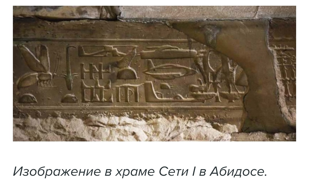На стене храма Сети I в Абидосе красовалось изображение... вертолёта. Да-да, именно вертолёта, рядом с которым отчётливо виднелись контуры танка и каких-то летательных аппаратов.