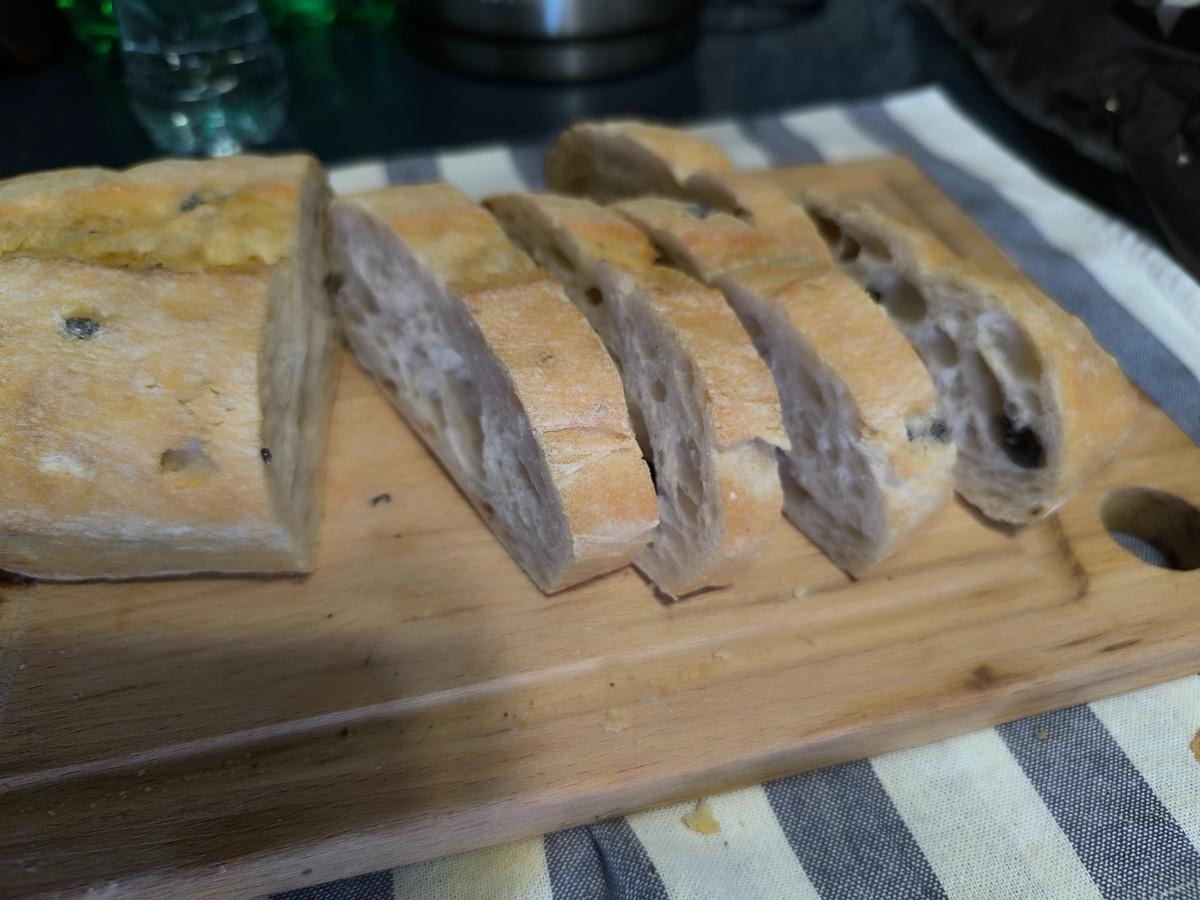 Щи получились зачётные. Хотя я их слепила из того, что было: утиные косточки и крылышки, остатки маринованной капусты со свеклой, остатки кочана свежей капусты, остатки зелени -- зелёного лука, укропа и петрушки. К закусочному счету подала сладкий красный лук, порезанный тонкими пёрышками и немного подсоленный, очищенный чеснок, мелко порезанную зелень, свежий огурчик, порезанный на тонкие ломтики, чуть подсоленный и поперченный, сало, порезанное тончайшими лепестками и ещё тёплую чиабатту с оливками из пекарни.
