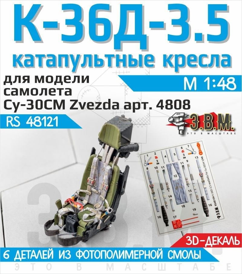 В.М. выпустили Катапультные кресла К-36Д-3,5 с подвесной системой из 3D-декали в 1/48 масштабе для модели Су-30СМ от Звезды. В наборе: - 2 кресла из фотополимерной смолы - 3D-декаль подвесной системы - классическая декаль с техническими надписями и табличками.
