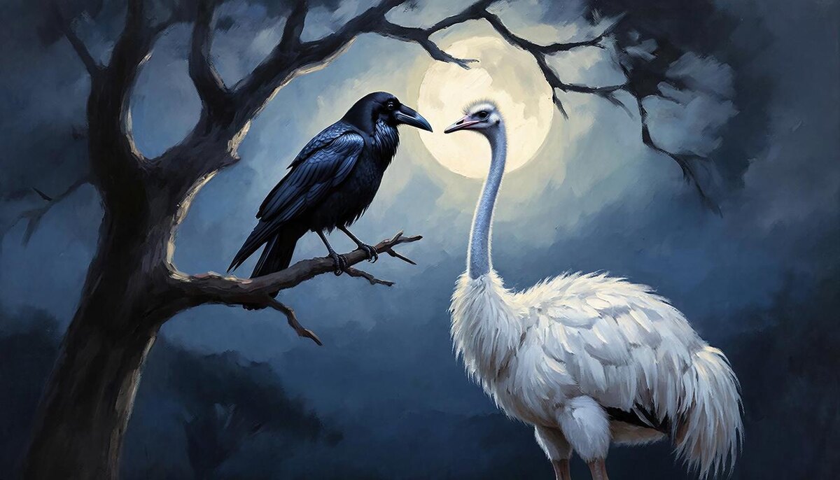 — О чём думаешь ты, мудрая птица? — обратился вдруг страус к вороне нежным голосом. Его длинные ноги легко ступали по мягкой траве, создавая лёгкий шорох.
