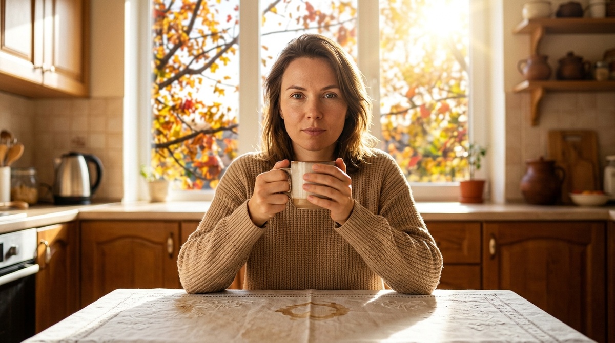 В октябре, ровно через год после того, как она вышла из подъезда с одним чемоданом, Марина сидела на своей кухне и пила кофе. За окном шелестела липа, которая уже облетала — последние листья, жёлтые, мокрые. На столе стояла белая скатерть — она сама постелила, потому что захотела, а не потому что так надо.