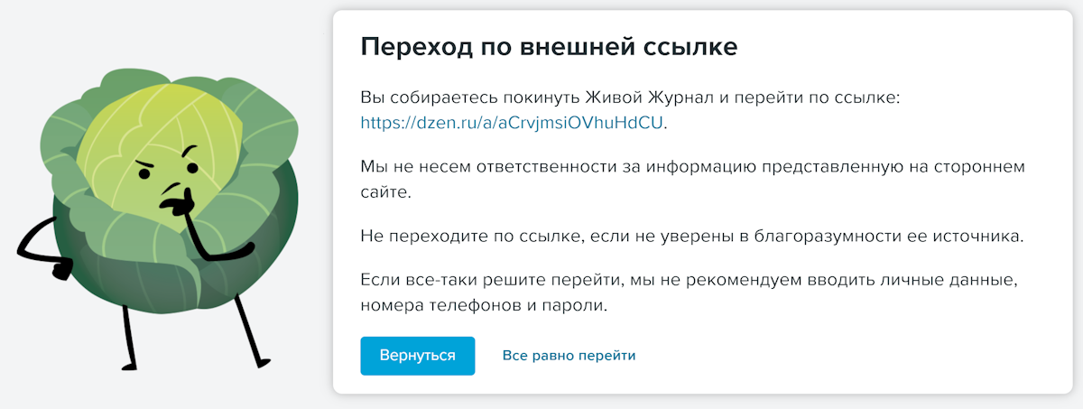 Уже много раз сталкивался с ситуацией когда какой-либо автор в Livejournal размещает в своем посте ссылки на разные интернет-ресурсы .При переходе по этим ссылкам выскакивает предупреждение с текстом :« Вы собираетесь покинуть Живой Журнал и перейти по ссылке: .Мы не несем ответственности за информацию представленную на стороннем сайте.»
