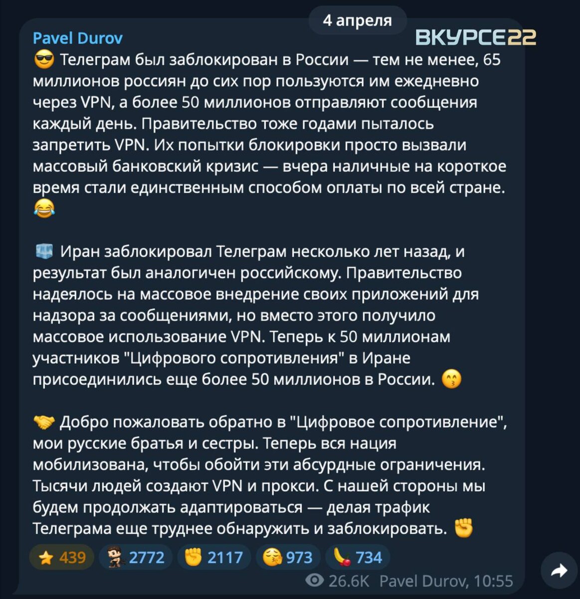 Основатель Telegram Павел Дуров прокомментировал ситуацию вокруг ограничений мессенджера в России. По его словам, несмотря на попытки блокировки, миллионы пользователей продолжают ежедневно пользоваться Telegram через VPN, а десятки миллионов отправляют сообщения каждый день. Дуров также отметил, что попытки ограничить VPN привели к сбоям в работе банковских сервисов, из-за чего в некоторых местах временно стало невозможно расплатиться картой. Дуров добавил, что команда Telegram продолжит адаптировать технологии, чтобы сервис оставался доступным для пользователей даже в условиях ограничений.