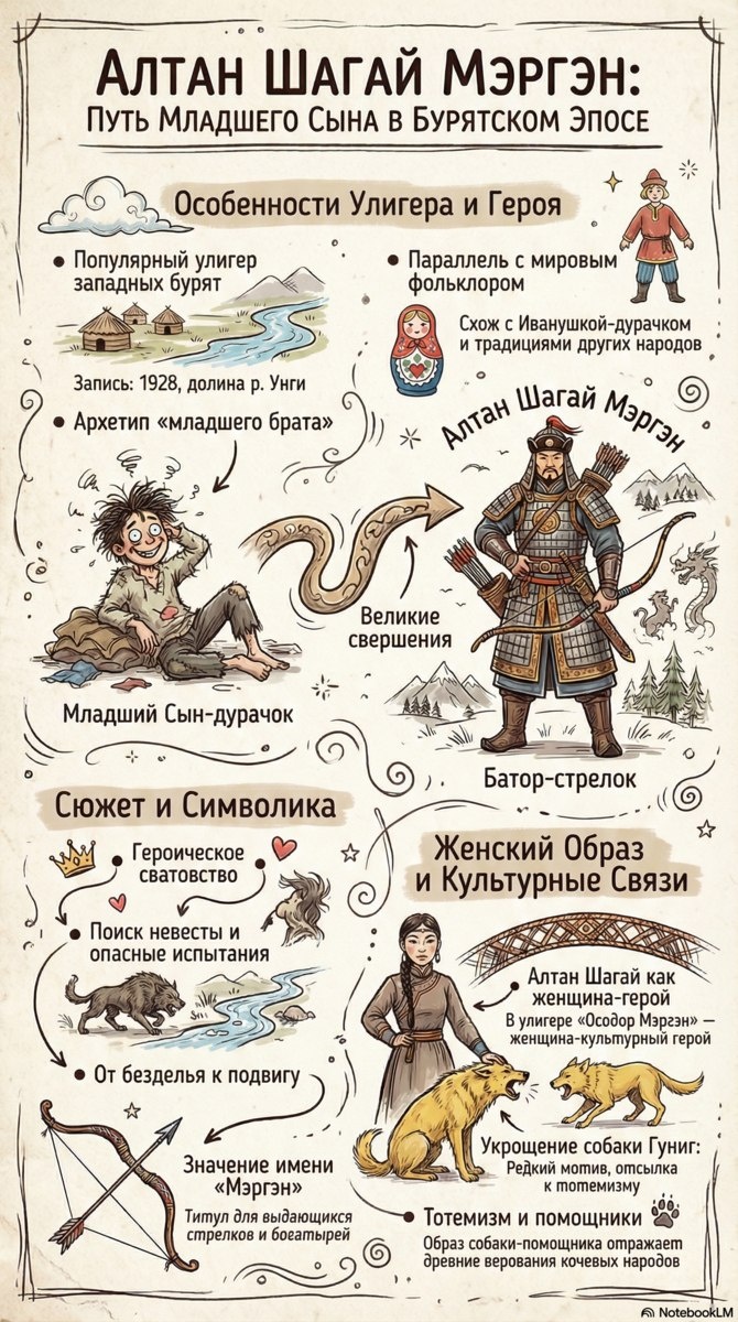 Алтан Шагай Мэргэн — популярный улигер западных бурят, записанный в 1928 году в долине реки Унги. Сюжет строится вокруг архетипа младшего сына, который на первый взгляд кажется неряхой и бездельником, но в итоге совершает великие свершения. Это роднит сказание с мировым фольклором и образом Иванушки-дурачка. Основная тема — героическое сватовство, поиск невесты и преодоление опасных испытаний. Титул Мэргэн подчеркивает статус героя как выдающегося стрелка и богатыря. Важную роль играет женский образ Алтан Шагай, выступающей в роли культурного героя в улигере Осодор Мэргэн. Она приручает бешеную собаку Гуниг — это редкий мотив, отсылающий к тотемизму и древним верованиям кочевых народов о животных-помощниках. Эпос иллюстрирует трансформацию героя от безделья к подвигу.