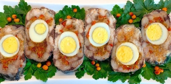 Расстелите на столе пищевую плёнку. Выложите на неё две тушки рыбы внахлёст (филе вверх). Посыпьте рыбу солью, перцем и половиной желатина. Затем равномерно распределите остывшую овощную зажарку, натёртые варёные яйца и посыпьте оставшимся желатином. Плотно сверните рулет с помощью плёнки. Чтобы конструкция была надёжнее, обвяжите её кулинарной ниткой.