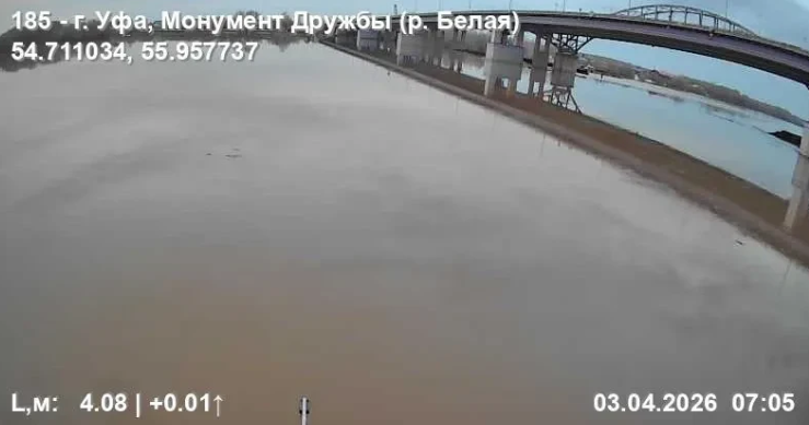 ⬆️ на реке Белой в городе Уфе в районе Монумента Дружбы, динамика уровня воды за сутки +58 см, текущий уровень 463 см, выход реки на пойму 600 см;