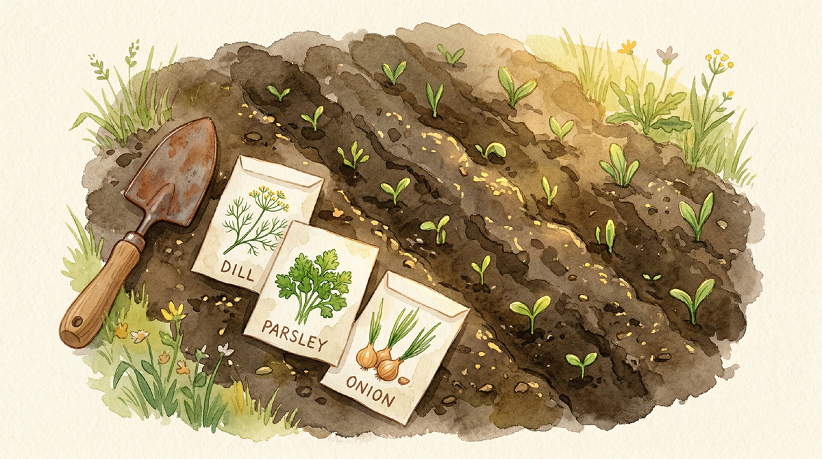 Каждый апрель один и тот же вопрос: уже можно сеять зелень или ещё рано? Ответ приятный — апрель для зелёных культур почти идеален. Лук, укроп и петрушка — холодостойкие растения, которые прорастают уже при +3–5°C. Пока томаты и огурцы ждут своего часа, грядки можно пустить в дело прямо сейчас. Разберём каждую культуру отдельно, с цифрами и практическими тонкостями. Холодостойкие культуры не просто переносят прохладу — им она нужна. При +3–5°C зелёные уже трогаются в рост, не вянут от поздних заморозков и не конкурируют с теплолюбивыми за место и время. Пока половина огорода ещё пустует, грядки с луком и укропом уже работают. Ещё один плюс — меньше сорняков в апреле. Грунт ещё не прогрелся, злостные сорняки только начинают просыпаться, а ваши посевы уже успеют взойти и окрепнуть. Лук-чернушку (семенной) сеют в апреле — начале мая. Сроки мягкие, главное — чтобы земля оттаяла хотя бы на 10–12 см. Подготовка семян. Замочите чернушку на 12–24 часа в тёплой воде (+30–35°C). Это ускоряет про
