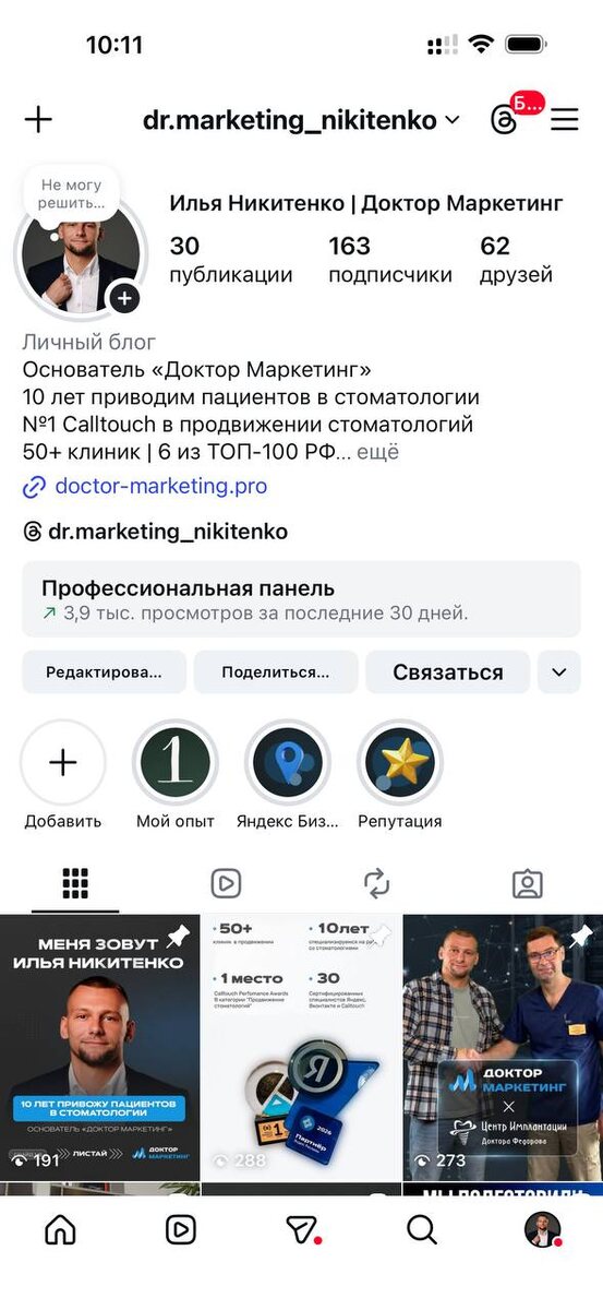 уверенно😅) А за последнее время я его начал активно вести и выложил интересные короткие публикации про то: - Почему банальное повышение прайса убьет вашу клинику? Прогноз 2026 - Почему отсутствие своего КТ гораздо более серьезная проблема чем думаю многие собственники? Особенно если вы намерены вкладываться в продвижение имплантации - Новости из параллельной вселенной про кризис компании nvidia которая не знает куда потратить 60млрд долларов. Который кстати набрал больше всего просмотров и откликов 😁 - Пост с полезной методичкой, как сделать авто публикацию из телеграм канала в MAX и в Дзен(кстати она сейчас сделала за меня эту публикацию, привет подписчикам здесь🤗) Поэтому буду рад, новым подписчикам там, вот ссылка https://www.instagram.com/dr.marketing_nikitenko В ТГ уже нас целых 800🎉, всем рады коллеги, будем и дальше радовать вас полезными материалами и делиться нашим опытом. Спасибо за то что с нами, и рекомендуете нас своим коллегам!🤝😌 Мы прилично выросли, на данн