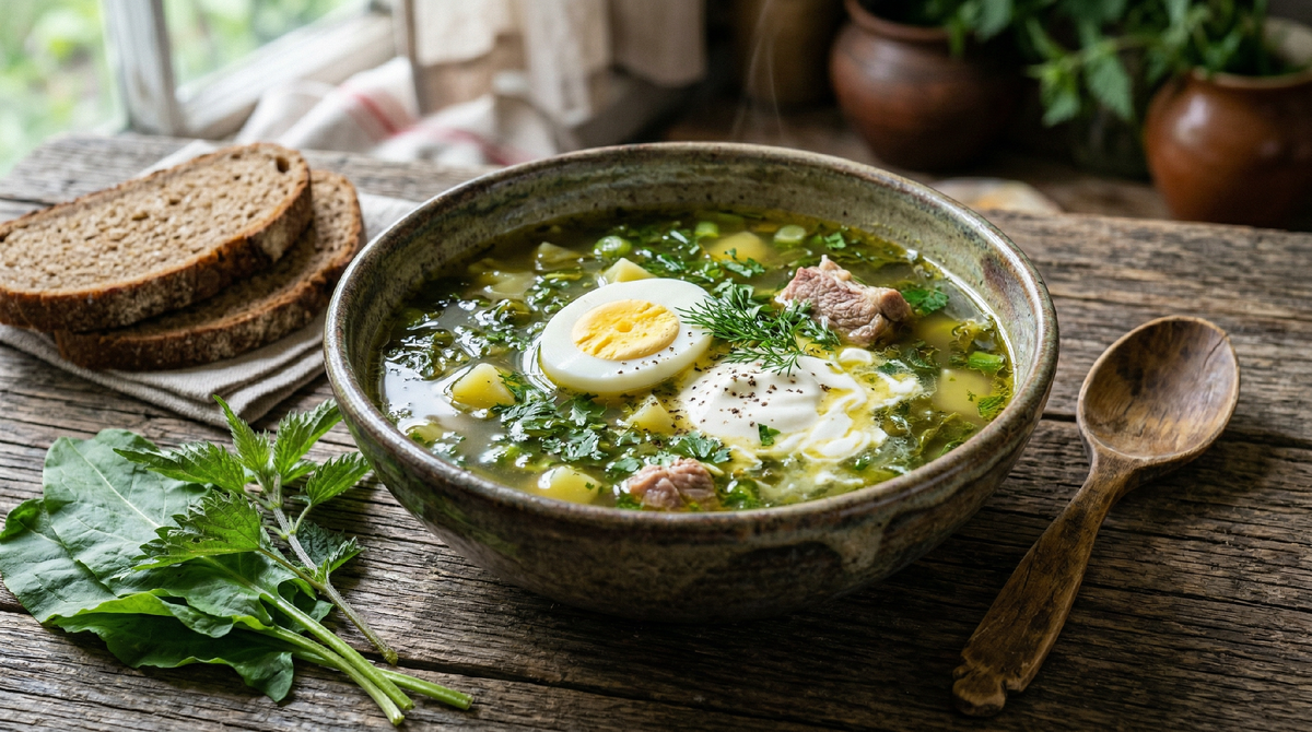 У меня этот борщ связан с детством. Бабушка варила его в конце апреля, иногда в начале мая, смотря какая выдавалась весна. Мы жили в частном доме, щавель рос вдоль забора сам по себе, крапива — за сараем, и никому в голову не приходило считать это сорняком. Наоборот, бабушка говорила, что крапива — самая полезная трава на участке, и сердилась, если кто-то её вырывал раньше времени. Борщ она варила в огромной кастрюле, на два дня, хотя он редко доживал до второго — разбирали за вечер. Ели со сметаной и варёными яйцами, с чёрным хлебом, и казалось, что ничего вкуснее просто не существует.