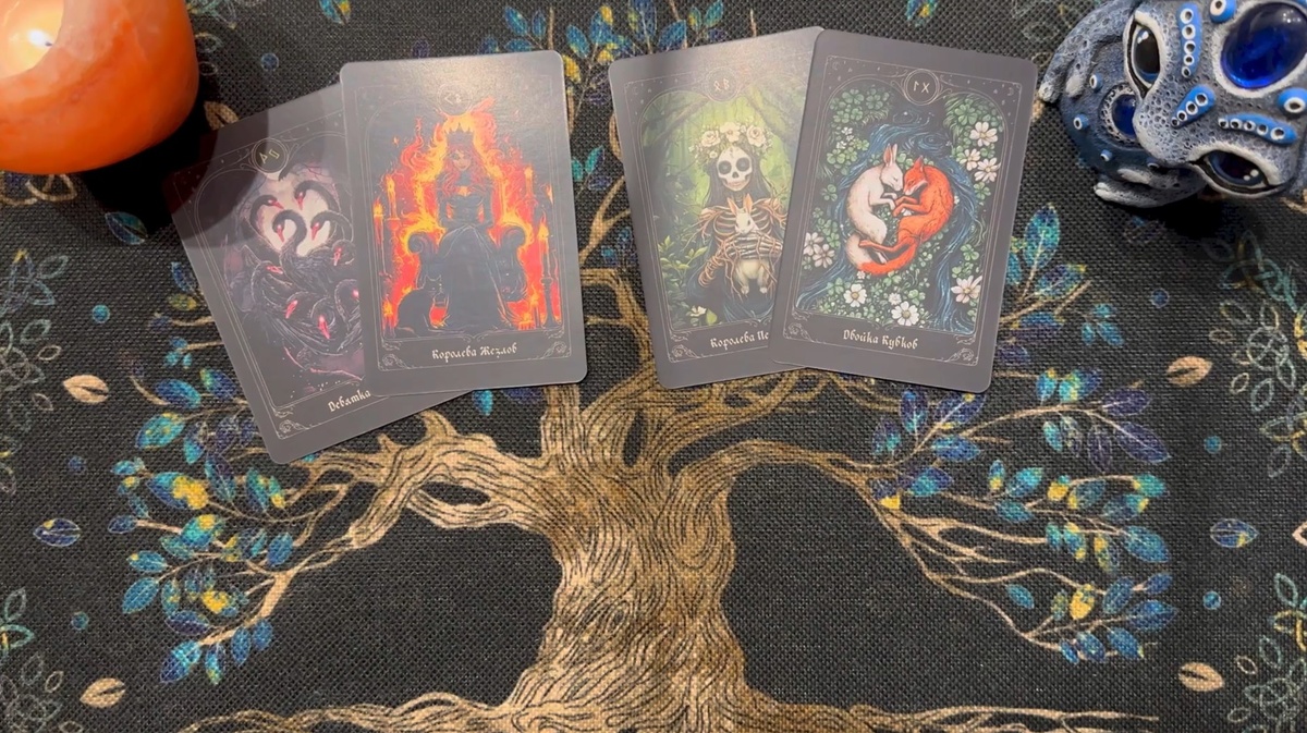 Всем привет! Добро пожаловать на канал. Меня зовут Мария. Сегодня смотрим «Тайную жизнь бывшего»: чем он сейчас занят, и думает ли он вообще о вас? Итак, давайте посмотрим, как у него дела. Выпало: Девятка Мечей, Королева Жезлов, Королева Пентаклей, Двойка Кубков. Сразу скажу — у него там две дамочки нарисовались. С одной — дела не очень. По Девятке Мечей ему тяжело, он реально страдает. Кошмары ночные, не ест, не спит, нормально делами заниматься не может — короче, бедолага в стрессе. А Королева Жезлов — это вообще огонь. Она может стресс доставить одним своим существованием. Такая крутая, вставит и провернёт, не думая о чужих чувствах. Но просто так она не вставляет — её надо довести. Либо тут ситуация «и хочется, и колется, и мама не велит». Смотрим дальше. Тройка Кубков… Не может он до нее достучаться. Почему? Потому что он там не один. Как минимум есть кто-то ещё. То есть мы говорим про любовный треугольник. И он ходит бедный, мучается: «Что же мне сделать?» Но Девяткой Мечей Коро