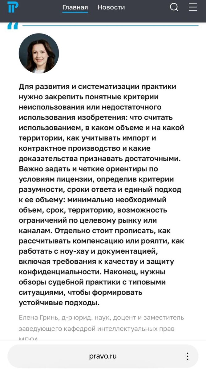 Делюсь моими комментариями на Право.ру. Веду экспертную работу в этом направлении, мне бы еще 200 часов в сутках и рассказывать обо всем в части своей экспертности. Вопросы, которые волнуют бизнес, новейшая судебная практика, КС РФ, в тч. В рамках IP Форума несколько раз обращались к теме и будем. На МИЮФ (Вы же все зарегистрировались, да?) будут секции, в чт, по тематике фармацевтики и за IP аспект теперь знаете, кто отвечает😉 Увидимся 14-15 мая на Покровке 47. Горжусь нашим Форумом (МИЮФ), очень большие масштабы, команда 🔥, даже удобная регистрация (да да, это тоже важно), буду не только экспертно участвовать, но и постараемся об основных секциях рассказать нашей командой союза юристов-блогеров. #еленагринь_ip