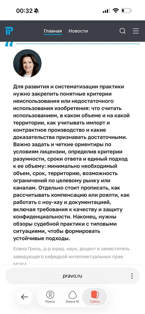 Делюсь моими комментариями на Право.ру. Веду экспертную работу в этом направлении, мне бы еще 200 часов в сутках и рассказывать обо всем в части своей экспертности. Вопросы, которые волнуют бизнес, новейшая судебная практика, КС РФ, в тч. В рамках IP Форума несколько раз обращались к теме и будем. На МИЮФ (Вы же все зарегистрировались, да?) будут секции, в чт, по тематике фармацевтики и за IP аспект теперь знаете, кто отвечает😉 Увидимся 14-15 мая на Покровке 47. Горжусь нашим Форумом (МИЮФ), очень большие масштабы, команда 🔥, даже удобная регистрация (да да, это тоже важно), буду не только экспертно участвовать, но и постараемся об основных секциях рассказать нашей командой союза юристов-блогеров. #еленагринь_ip 💬MAX 💙ВК