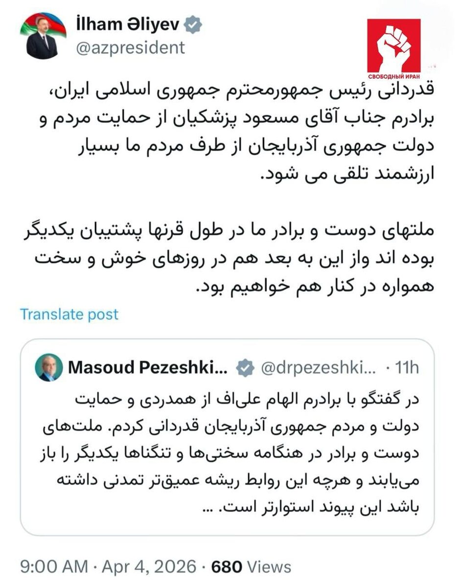 🤝 Президент Азербайджана Ильхам Алиев в X поблагодарил Масуда Пезешкиана за поддержку Азербайджана и назвал отношения двух стран дружескими и братскими. По его словам, Баку и Тегеран сохраняют взаимную поддержку и в спокойные дни, и в трудные моменты. Подпишитесь на канал