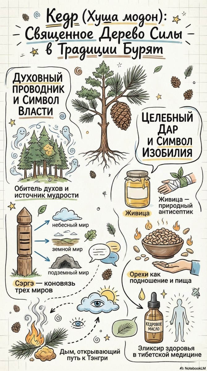 Кедр (Хуша модон) — священное древо силы, символ могущества и источник мудрости в традиции бурят. Кедровые рощи считаются обиталищем мощных духов, а дым хвои и смолы служит проводником молитв к небесным тэнгри. Именно из кедра часто изготавливают сэргэ — ритуальные коновязи, соединяющие верхний, средний и нижний миры. Кедр дает бесценные дары для здоровья и обрядов. Кедровая живица (смола) — природный антисептик с ранозаживляющими свойствами. Орехи символизируют изобилие и используются как подношение духам на тайлганах. В тибетской медицине высоко ценится кедровое масло — настоящий эликсир здоровья. Это дерево олицетворяет неразрывную связь человека с божественными силами и чистоту помыслов, дарующую жизненную стойкость.