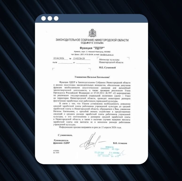 Со всех регионов России поступают жалобы на низкие заработные платы работников культуры. Руководитель фракции ЛДПР в Законодательном Собрании Нижегородской области Владислав Атмахов направил письмо министру культуры Нижегородской области Наталье Евгеньевне Сухановой, чтобы у выяснить соотношение реальной зарплаты педагогов детских школ искусств со средней зарплатой по региону. 📍ЛДПР настаивает - недопустимо, чтобы система оплаты не позволяла их доходам даже приблизиться к уровню педагогов общеобразовательных школ. Это ведёт к оттоку квалифицированных кадров, снижению качества подготовки учеников и уровня художественного образования в стране. Кроме того, на приёмах граждан жители жалуются на состояние домов культуры. В небольших населённых пунктах учреждения культуры находятся в ветхом состоянии, не хватает техники. И пожилым, и молодёжи нужны нормальные места для досуга. ⚡Напомним, в рамках нацпроекта «Культура» в Нижегородской области в 2024 году капитально отремонтировали четыре