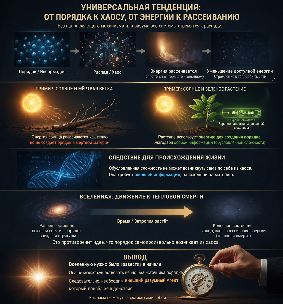 Существует универсальная тенденция всех систем материи и энергии к распаду. Доступная энергия рассеивается, порядок теряется. Без заранее запрограммированного механизма или разумного действия даже открытые системы будут стремиться от порядка к хаосу, от информации к её потере и к уменьшению доступной энергии. Именно поэтому тепло всегда течёт от горячего к холодному и почему энергия солнца не способна оживить мёртвую ветку (в отличие от зелёного растения, которое содержит специфический, заранее запрограммированный механизм, направляющий энергию на создание особого порядка, известного как обусловленная сложность.