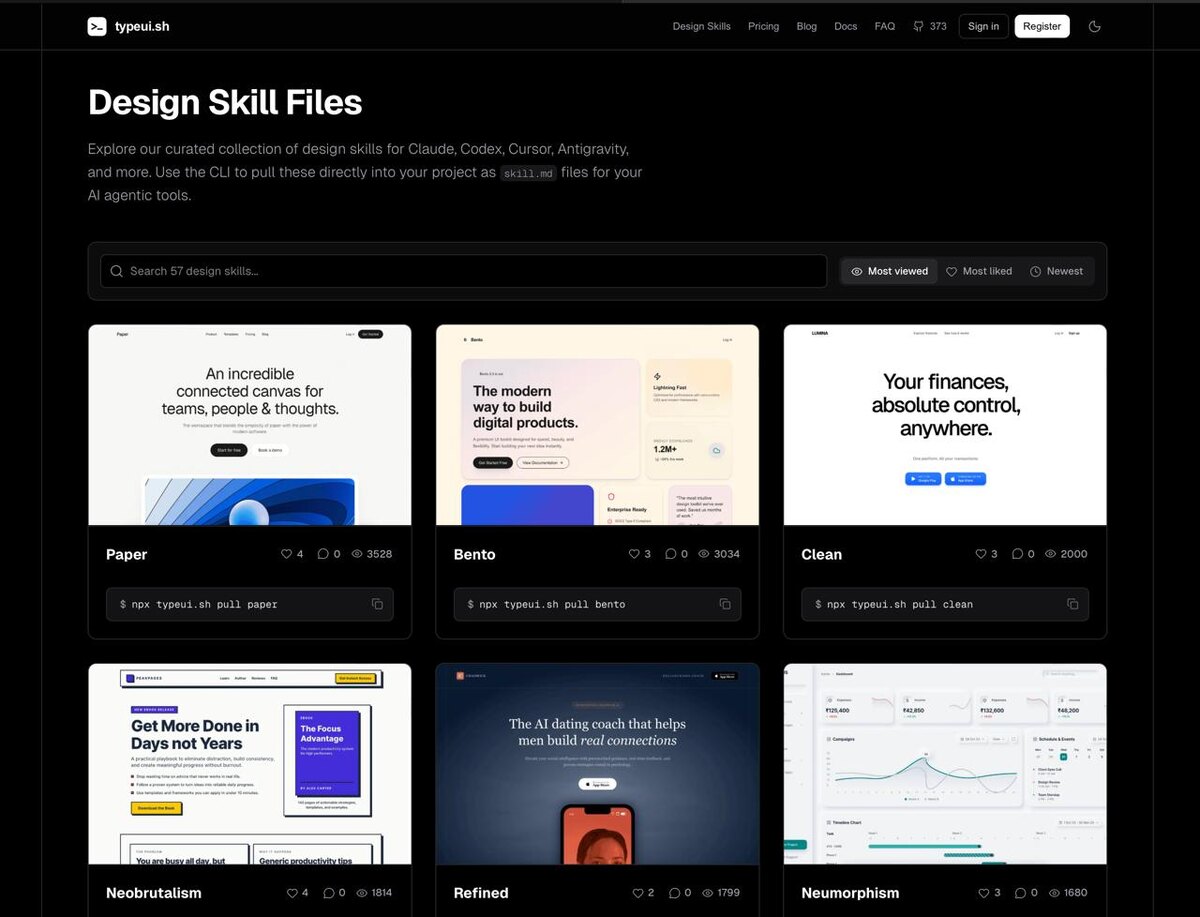 вам подарок Нашел библиотеку из бесплатных скиллов для Claude, Cursor и Codex, которые превратят ИИ-агентов в гуру дизайна. — Каждый скилл соответствует какому-то стилю; — Выбираем нужный, копируем команду и агент моментально учится работать с этим стилем; — Бесплатно и регистрацию не просят. Становимся вайб-дизайнером — здесь. @ShvedkovPRO