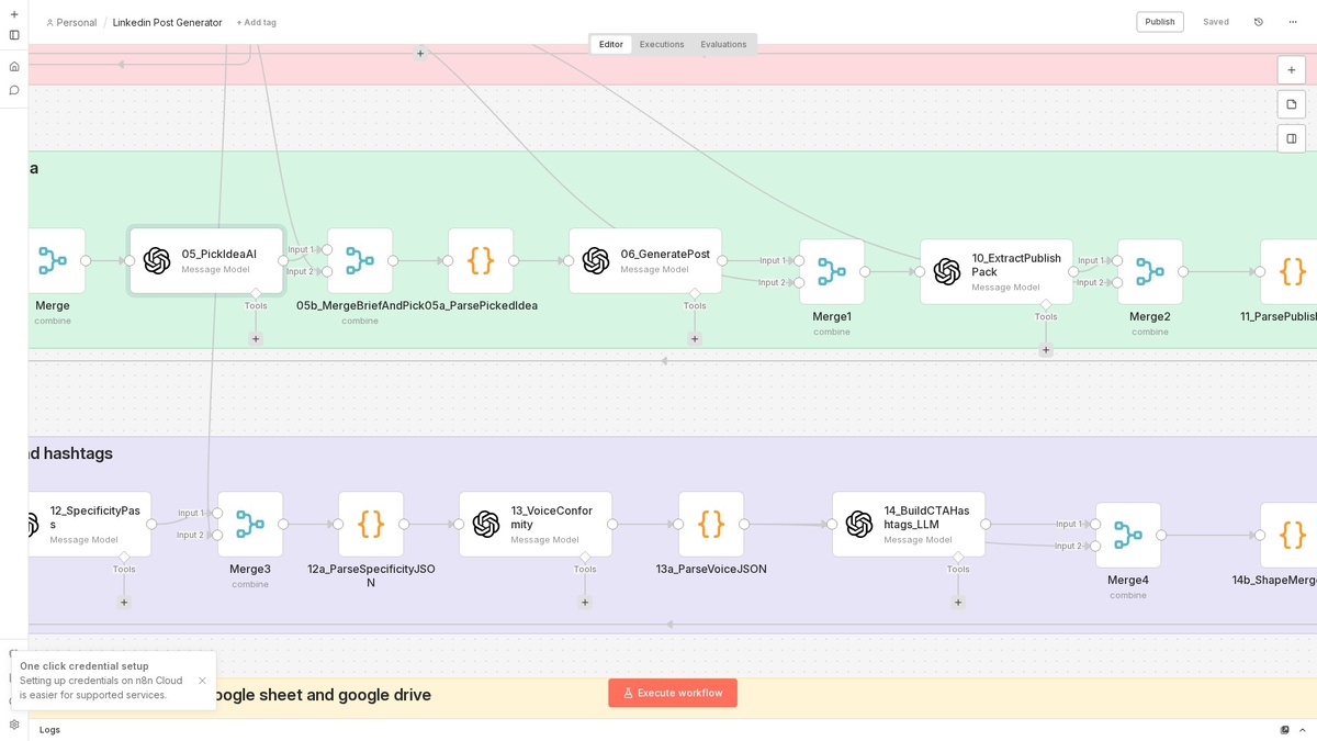 ⚡ Что делает: Автоматизация создает посты для Linkedin, используя данные из Google Sheets и генерируя текст с помощью OpenAI. Каждые 30 минут триггер запускает процесс, который собирает информацию, обрабатывает её и сохраняет результаты в Google Drive. 👥 Кому подойдёт: Идеально для маркетологов и контент-менеджеров, стремящихся упростить создание постов. 💡 Пример: Собирает идеи из таблицы, генерирует уникальный контент и автоматически загружает его в Google Drive. 🔗 Ноды: scheduleTrigger, Google Sheets, OpenAI, Google Drive, код 📊 Сложность: Сложный #n8n #automation #nocode #googledrive #googlesheets #openai ════════════════ 🎬 YouTube | ⚙️ Канал | 💬 Чат | 📮 Реклама