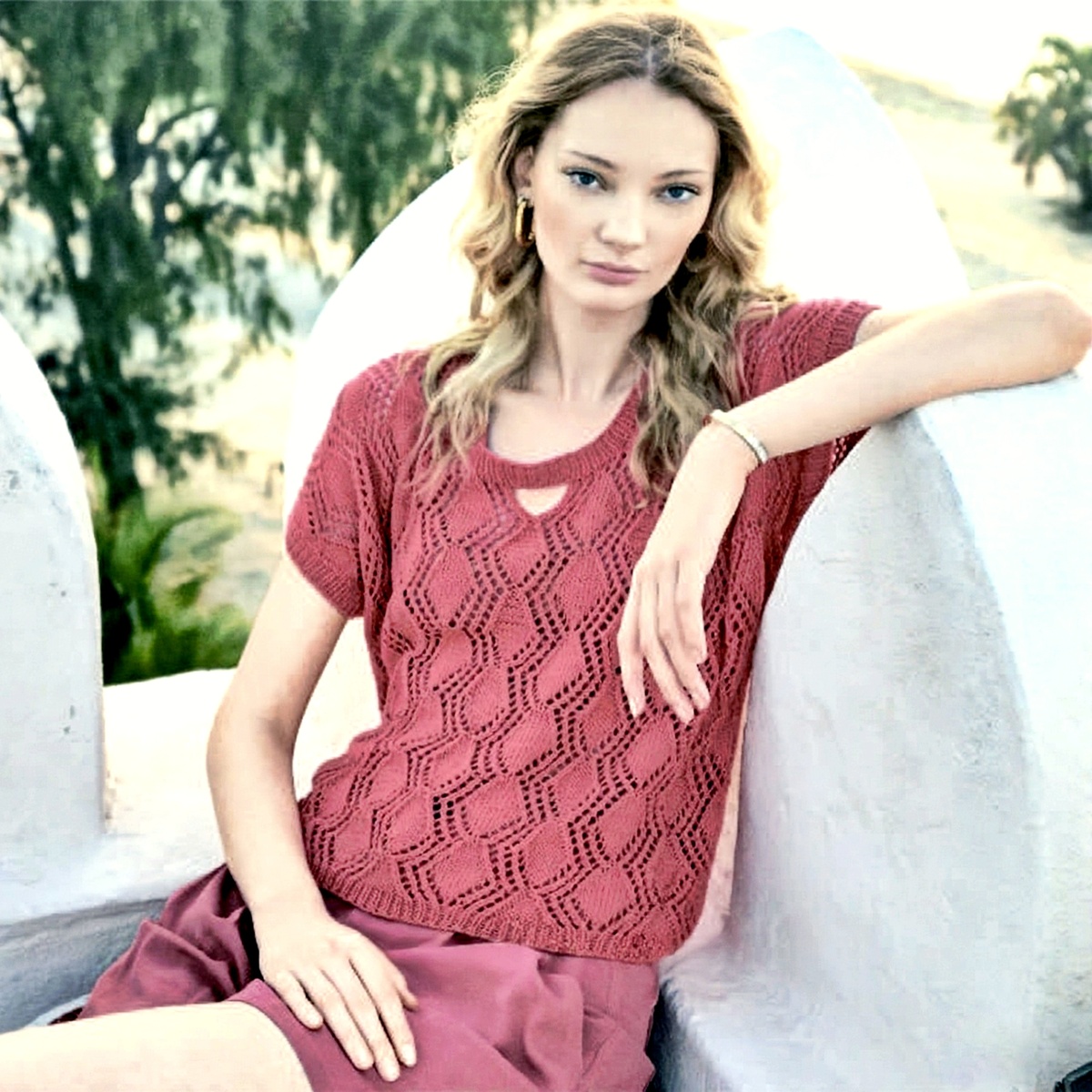 № 1: Тёмно-коралловый пуловер с коротким рукавом и фигурным вырезом ♥