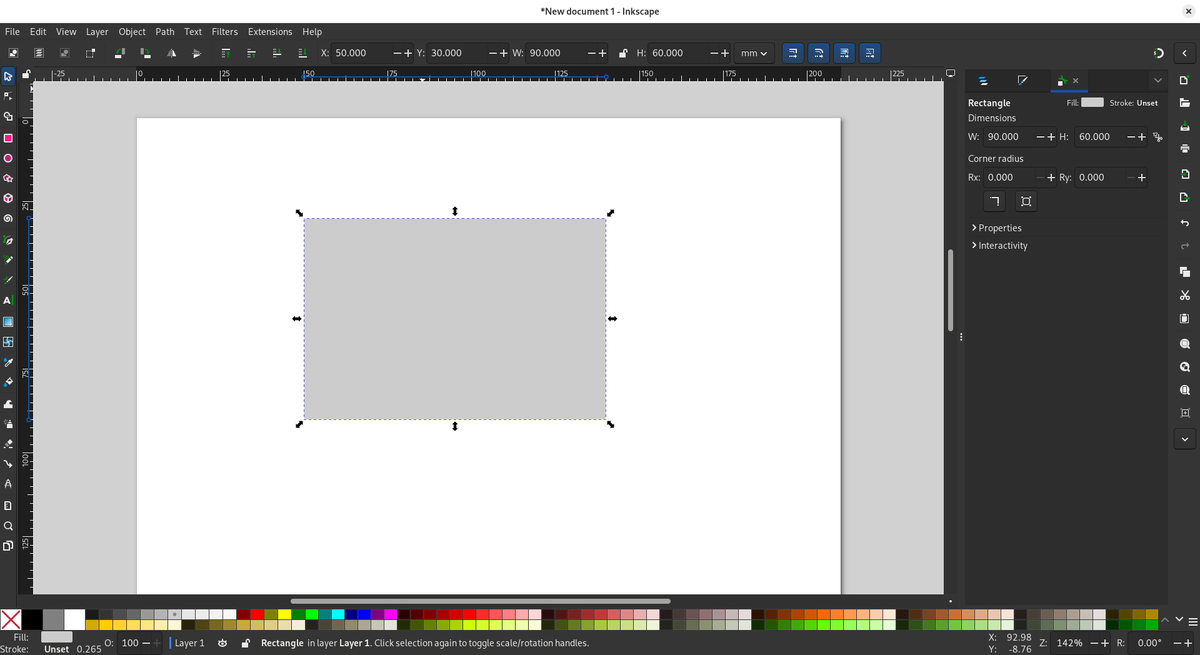 Я решил написать эту заметку, так как программой Inkscape пользуются не только художники и дизайнеры. Я намеренно хочу показать подход, который основан на точных измерениях и не требует вообще никаких навыков рисования. Давайте представим, что мы хотим быстро и просто нарисовать схему дачного участка или расположение столика и полки в гараже. Посмотрите на скрин. Я выбрал в меню слева прямоугольник и нарисовал его. У него есть совершенно конкретное положение относительно листа, которое редактируется в верхней панели. Рядом указаны ширина и высота. По сути, получается карта, которая нам показывает размеры объектов и их расположение. Как вы понимаете, я хочу правильно показать все габариты и координаты. А на следующем скрине показано редактирование цвета фигуры. Справа видны параметры (пункт контекстного меню Fill and Stroke). Вы можете использовать ползунки выбора цветов или явно указать числовые значения, если действуете на основании справочника. По аналогии редактируем цвет контура в