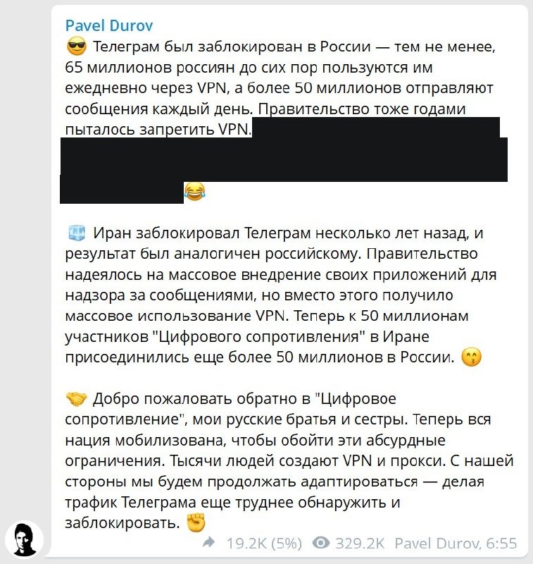 Telegram запрещен в России, однако 65 миллионов россиян по-прежнему используют его ежедневно через VPN, при этом более 50 миллионов отправляют сообщения каждый день, заявил Павел Дуров.