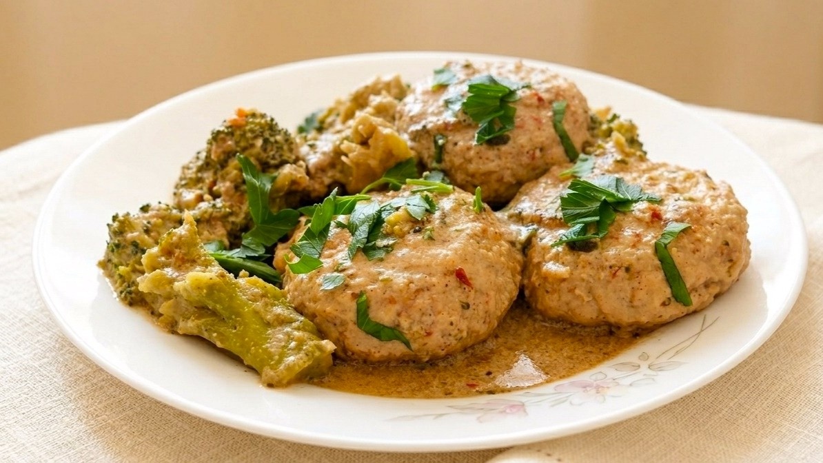 Петрушка свежая, небольшой пучок За время тушения сухари с поверхности котлет постепенно отдают панировку в соус и он густеет без добавления муки. Получается бархатистая, обволакивающая подлива. За 2-3 минуты до готовности добавляю щепотку сухого чеснока, мускатного ореха и сладкой паприки. Мускатный орех здесь мягко раскрывает сливочный вкус сметаны, паприка даёт тёплый оттенок, а чеснок объединяет всё вместе. Перемешив