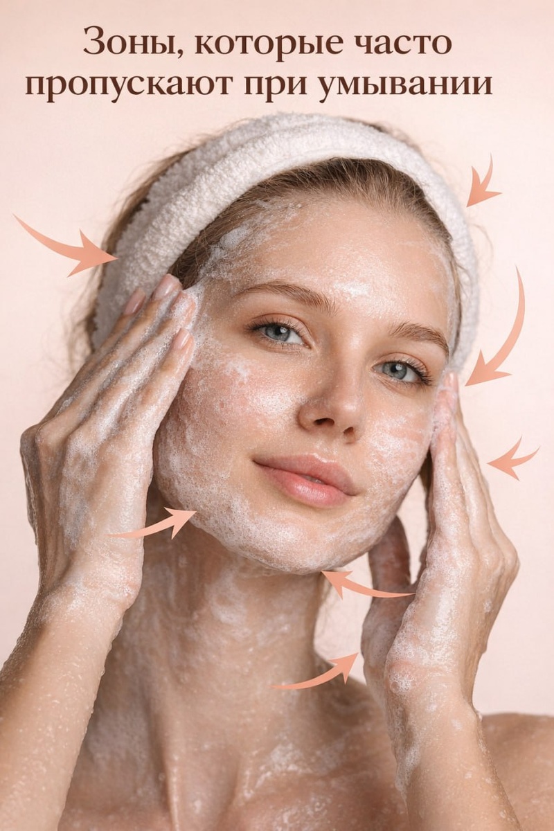 В прошлый раз я рассказывала о первой частой ошибке - слишком коротком времени умывания, когда очищающее средство просто не успевает нормально поработать на коже. А сегодня расскажу про вторую ошибку, которая встречается не реже. И это пропуск отдельных зон лица при умывании. Причём, что интересно, многие люди действительно как будто не до конца ощущают границы своего лица, даже когда смотрят на себя в зеркало. И если начать наблюдать, как человек умывается или снимает макияж, становится очень заметно, что часть зон просто выпадает из очищающего ритуала. Иногда это делают и сами специалисты. Особенно когда речь идёт о периферии лица и зоне под нижней челюстью. А потом мы удивляемся, почему воспаления, неровности, забитость пор или ощущение «что-то не то» появляются именно там, где кожа как будто бы вообще «ни при чём». На самом деле очень даже при чём. При умывании важно не забывать очищать: — зону около волосистой части головы на лбу — периферию лица — височную область — боковы
