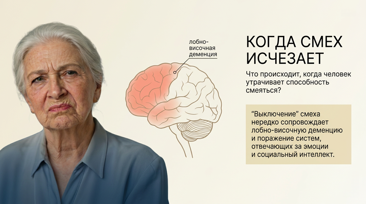 Есть отдельные работы, где изучали, как меняется чувство юмора при разных видах деменции. При лобно‑височном варианте оказалось характерно не только то, что человек реже смеётся, но и то, над чем он смеётся: