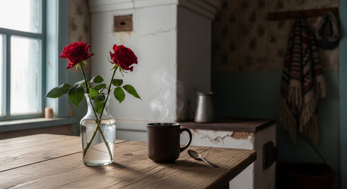 Перед ним — ваза. В вазе — две розы. Красные, немного поникшие уже, но всё ещё живые. Привёз из города три дня назад — специально, знал, что сегодня понадобятся.