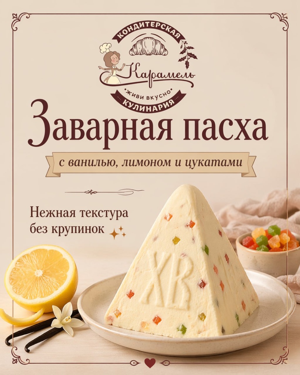 нежной, сливочной и без крупинок ✨ Секрет - в правильной текстуре и последовательности 👇 Здесь всё довольно просто, если соблюдать шаги: — сначала пробиваем творог до гладкости — готовим крем англез (до ~82°C) — аккуратно соединяем, сохраняя воздушность Добавляем цукаты, формируем и даём стабилизироваться и получаем идеальный результат 💛 Вкус получается мягкий, сливочный, с лёгкой лимонной ноткой и приятной текстурой Та самая пасха, которая получается как из кондитерской Сохрани рецепт, чтобы не искать перед Пасхой 📌 #пасха #заварнаяпасха #пасхарецепт #творожнаяпасха #десертынапасху #кондитерская #домашниерецепты #рецептпошагово #вкусноидома #пасхальныйстол #карамель #кондитерскаякарамель