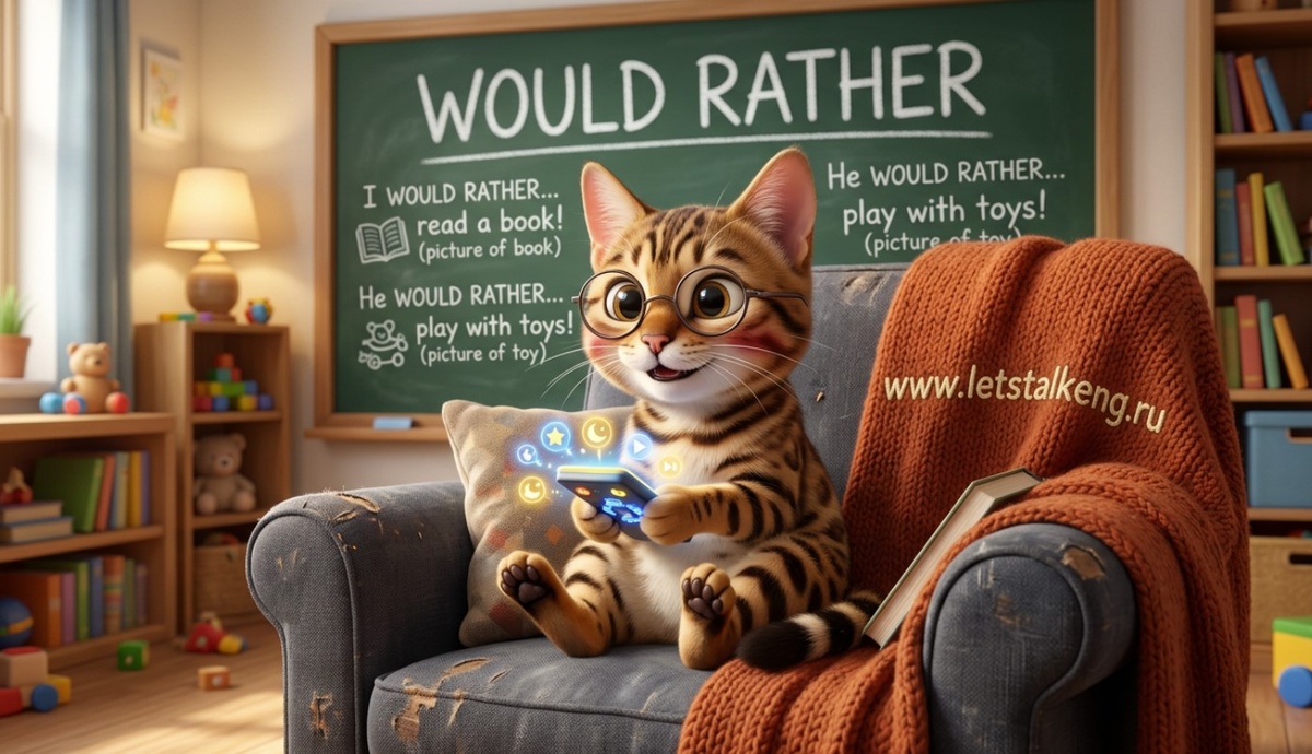- Фраза would rather — это свободная птица (или кошка!). Она ненавидит лишние детали и шапочки: I would rather stay inside.