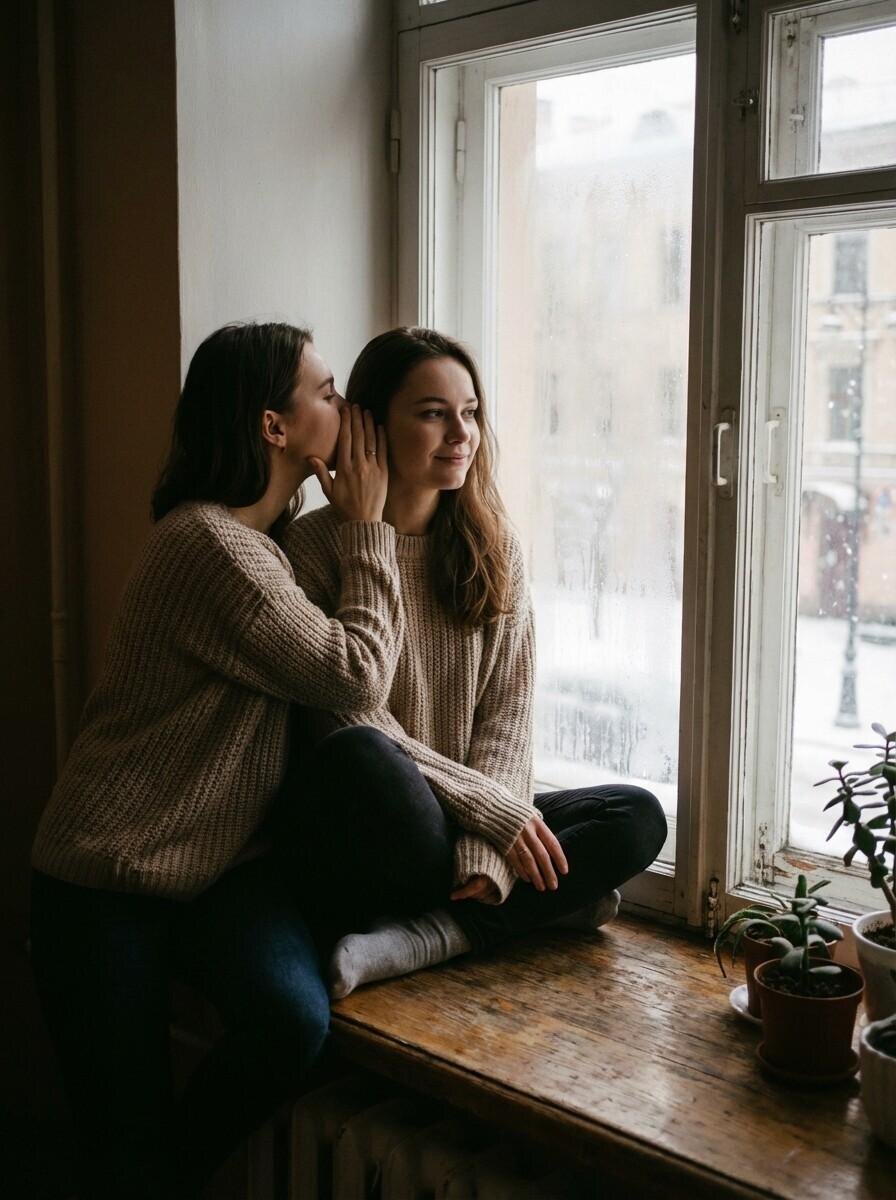 Уютный промт двух подруг на подоконнике у окна с дождём или снегом и шёпотом на ухо