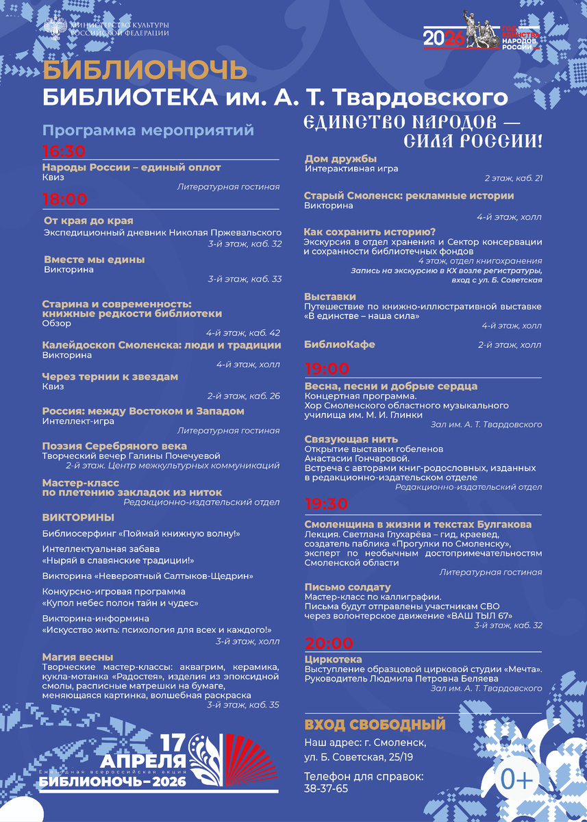17 апреля областная библиотека им. Александра Твардовского приглашает на Библионочь «Единство народов – сила России»! В программе: увлекательные экскурсии в книгохранилище и в редкий фонд, литературно-музыкальный вечер о поэтах Серебряного века, лекция о Михаиле Булгакове, встреча с авторами книг-родословных, мастер-классы, выставки, викторины и конкурсы, концертная программа, циркотека и многое другое. Приходите всей семьей! Будет интересно! Телефон для справок 32-67-65.