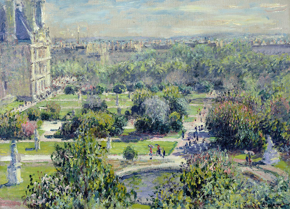 Скромный таможенник Виктор Шоке был одним из первых сторонников Поля Сезанна (1839–1906). Ограниченность в средствах не помешала ему собрать значительную коллекцию, которая включала, наряду с работами художника из Экс-ан-Прованса, произведения других импрессионистов. Он регулярно открывал свой дом для художников, а в 1876 году предоставил свою квартиру Клоду Моне (1840–1926). Расположенная на пятом этаже здания по адресу 198 rue de Rivoli в Париже, эта квартира открывала захватывающий вид на Тюильрийский сад, вдохновивший Моне на создание четырех картин. Рассматриваемая версия из Музея Мармоттан-Моне считается наиболее удачной. Она отличается сбалансированностью композиции. Массив павильона Марсан слева и высокая линия горизонта определяют пространство, посвященное изображению формального французского сада. Пруды, клумбы и рощи создают поэтическую обстановку, дополненную упорядоченной планировкой пешеходных дорожек и непрерывным расположением скульптур. Палитра светло-охристых