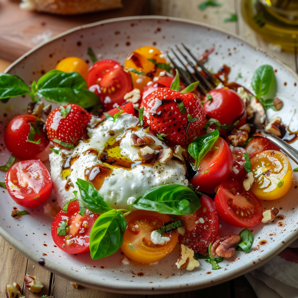 Клубнику режем пополам, томаты — крупно. Собираем: Сначала томаты + клубника, потом сверху прямо руками рвём сыр, добавляем базилик. Смешиваем оливковое масло, чуть мёда, крем бальзамик, соль, перец, немного лимонной цедры, орехи. С цедрой и бальзамиком — аккуратно. Они тут не главные герои. Можно подавать. А если хочется ещё такого, м