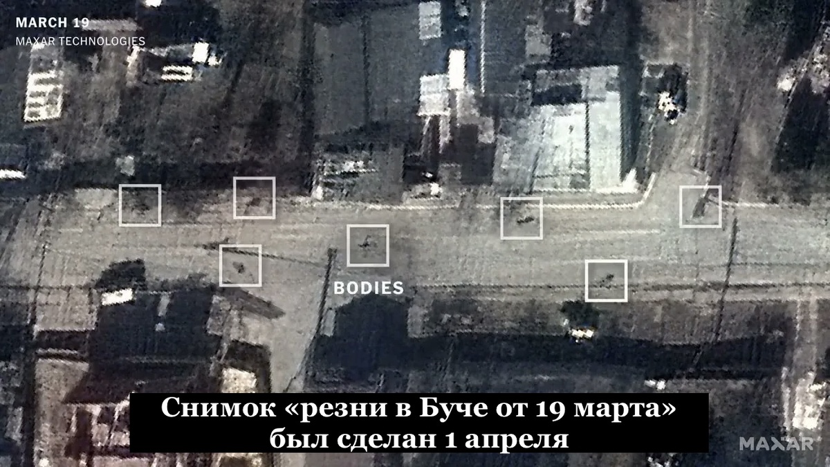 «В первую очередь вызывает вопрос подлинность снимков. Все снимки спутников Maxar за март в открытом доступе имеют вес 50 мегабайтов, что не позволяет достоверно разглядеть тела на них — такая детализация возможна от 100-110 мегабайтов. Газета The New York Times работала, судя по качеству картинки, со снимком от 120 мегабайтов (при этом снимка за 19 марта, с которым работали журналисты NYT, вообще нет в открытом каталоге Maxar)», — утверждается в посте. Авторы отметили, что это может свидетельствовать о том, что компания-владелец спутников заменила мартовские снимки и снизила их качество, чтобы скрыть подлог.