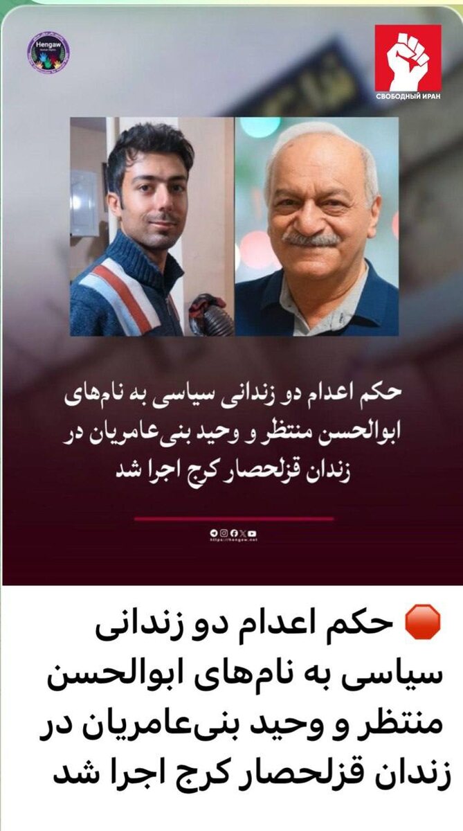 😢 Судебная власть Ирана сообщила о казни Аболхасана Монтазера и Вахида Бани-Амирийана, которых приговорили к смертной казни по обвинениям, в том числе за мятеж через участие в действиях под руководством организации Моджахедин-е Халг. По данным Hengaw, 30 марта сотрудники охраны и сил безопасности ворвались в четвёртый блок тюрьмы Гызылхисар в Карадже, избили заключённых дубинками и увели их в неизвестном направлении. Ранее иранские власти также объявляли о казни ещё четырёх политзаключённых 31 марта и 1 апреля. Подпишитесь на канал