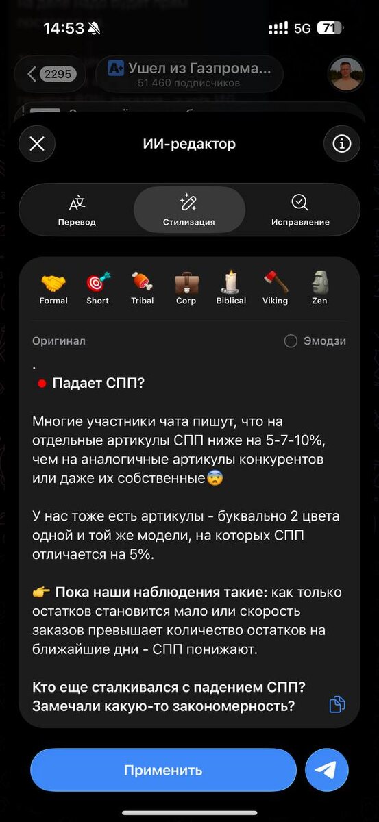 Telegram встроил ИИ-редактор прямо в поле ввода — теперь можно сокращать текст, менять стиль, исправлять ошибки и переводить одним кликом. Почему это важно для селлеров: • Ускоряет создание и правку текстов для постов и описаний товаров — меньше времени на рутину. • Упрощает коммуникацию с клиентами: можно быстро стилизовать ответы или исправить ошибки. • Повышает качество контента без найма копирайтеров для базовых задач. • Интегрирует рабочие процессы в одном мессенджере — меньше переключений между сервисами. Гипотезы: • ИИ-редактор снизит зависимость от внешних копирайтеров для простых задач, особенно у селлеров с малым бюджетом. • Telegram станет популярнее для бизнес-коммуникаций, так как добавляет рабочие инструменты. • Функция может стимулировать селлеров активнее вести контент и общение прямо в мессенджере. Что делать селлеру: • Протестируйте ИИ-редактор для создания постов и описаний товаров — оцените, насколько он справляется с вашими задачами. • Используйте его для оптимизац