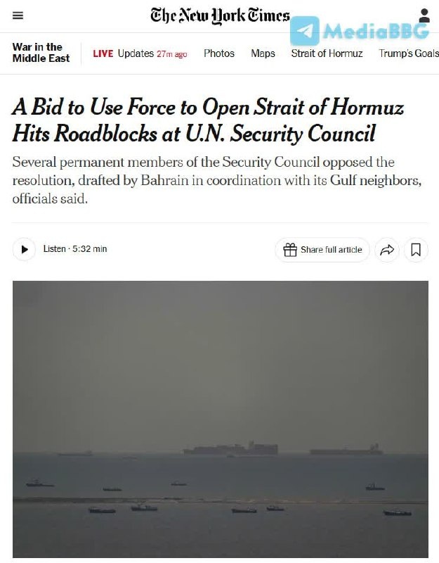 Россия, Китай и Франция заблокировали попытку арабских стран через Совет Безопасности ООН получить разрешение на военные действия против Ирана для открытия Ормузского пролива. Резолюция Бахрейна, поддерживаемая странами Персидского залива, предусматривала использование силы для обеспечения судоходства, но постоянные члены Совета с правом вето выступили против таких формулировок @geonrgru | 🇷🇺 MAX | sponsr.ru